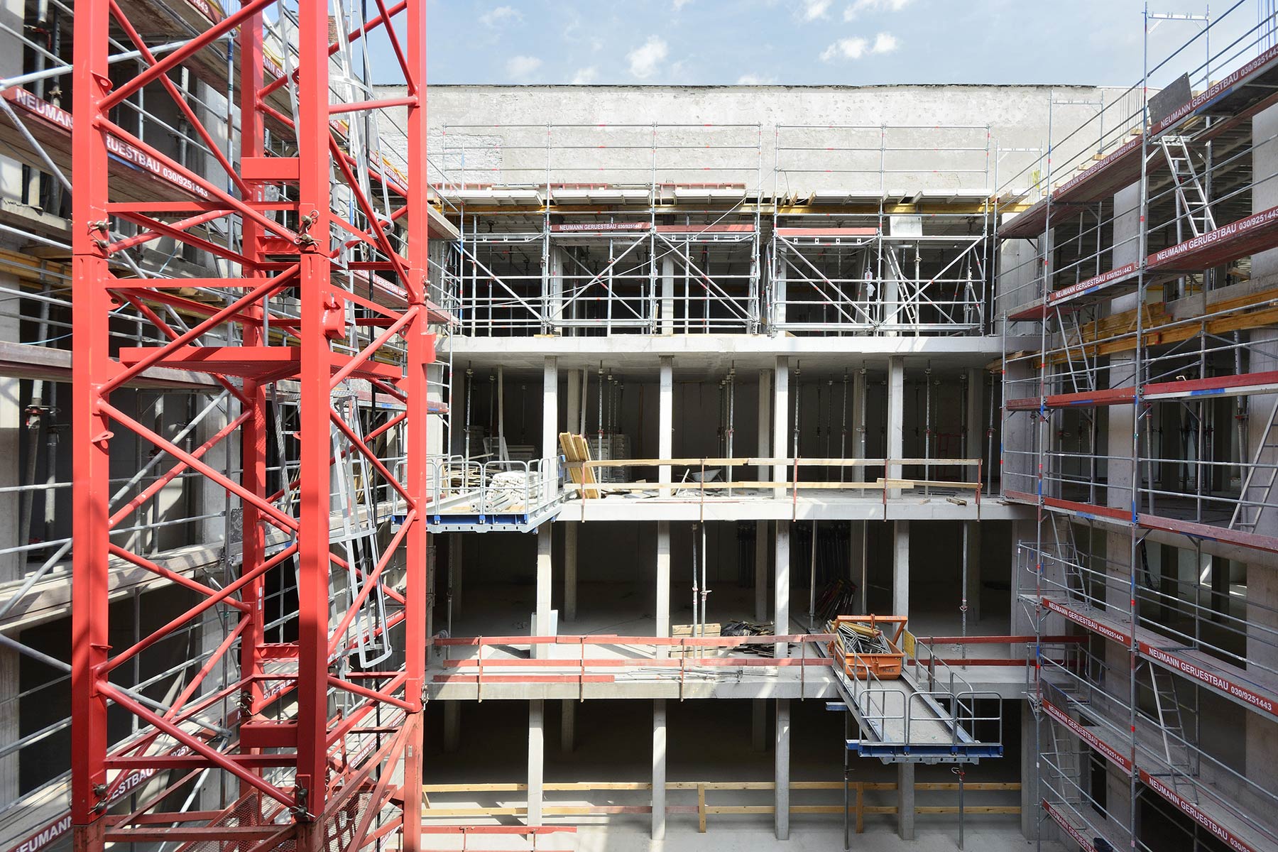 Durante la construcción del Palais Holler, una parte de la acera del Ku'damm tuvo que ser cerrada y el tráfico peatonal desviado para hacer espacio para el punto de descarga, donde bombas de concreto premezclado montadas en camiones de CEMEX suministran el proyecto. La logística para compartir un espacio de esta manera pone en relieve la necesidad de una operación eficiente, lo que requiere una cooperación transparente con el cliente. Tanto el cemento y los aditivos han sido facilitados por los equipos de CEMEX, que finalmente se espera entregarán 6.000 metros cúbicos de concreto premezclado para el trabajo estructural del proyecto.